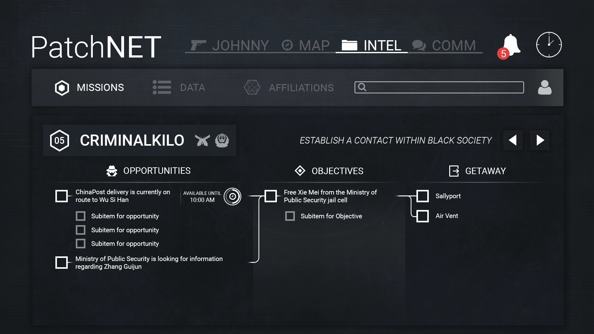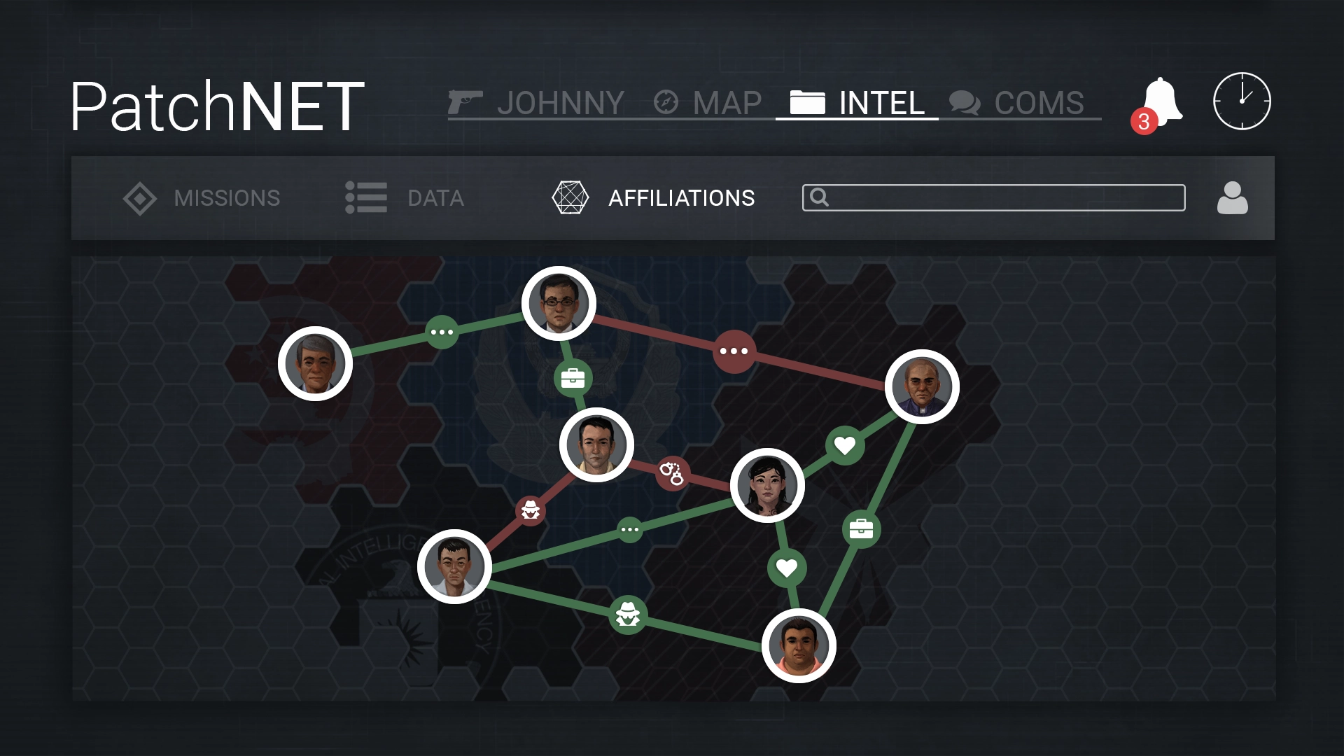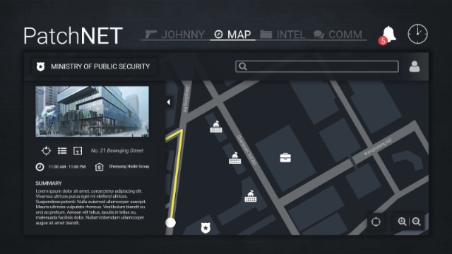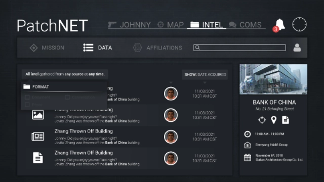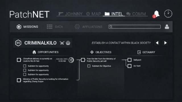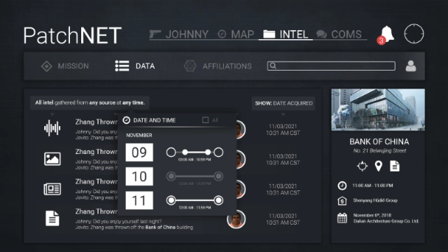 Because of the themes and subject matter, designing the game’s UI presented a challenge: it needed to communicate a large volume of information quickly, without overwhelming the player. Moreover, both the main menu and in-game menu had to visually explore the dark, and often complex, work of spycraft.